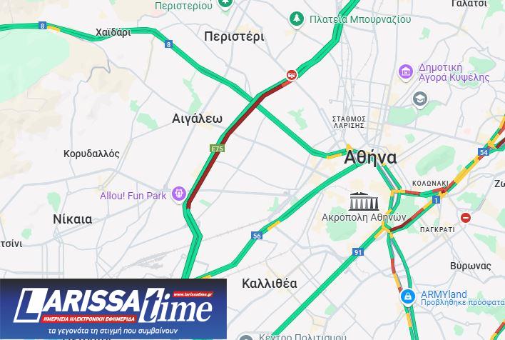 Όπως φαίνεται και στον χάρτη, τα οχήματα σχηματίζουν ουρές χιλιομέτρων και το μποτιλιάρισμα ξεκινά από την περιοχή του Ρέντη.