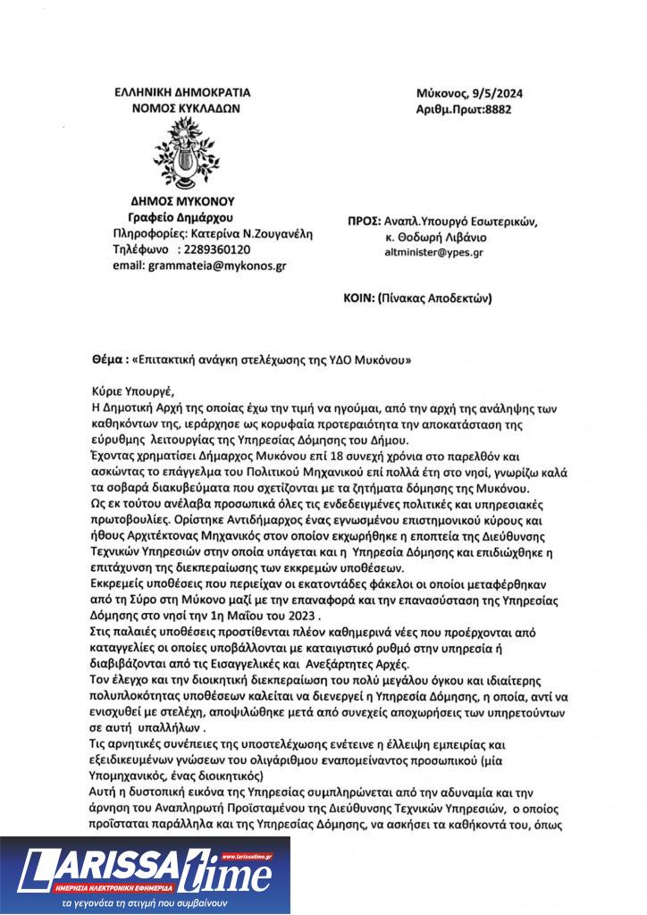 Ο δήμαρχος Μυκόνου σε άλλη επιστολή του προς τις αρμόδιες αρχές αναφέρει ότι: «Η Υπηρεσία Δόμησης, αντί να ενισχυθεί με στελέχη, αποψιλώθηκε μετά από συνεχείς αποχωρήσεις των υπηρετούντων σε αυτή υπαλλήλων. Παρά την αδιαμφισβήτητη βούληση της δημοτικής αρχής να παταχθεί η αυθαίρετη δόμηση, η κατάσταση έχει περιέλθει κυριολεκτικά σε αδιέξοδο».
