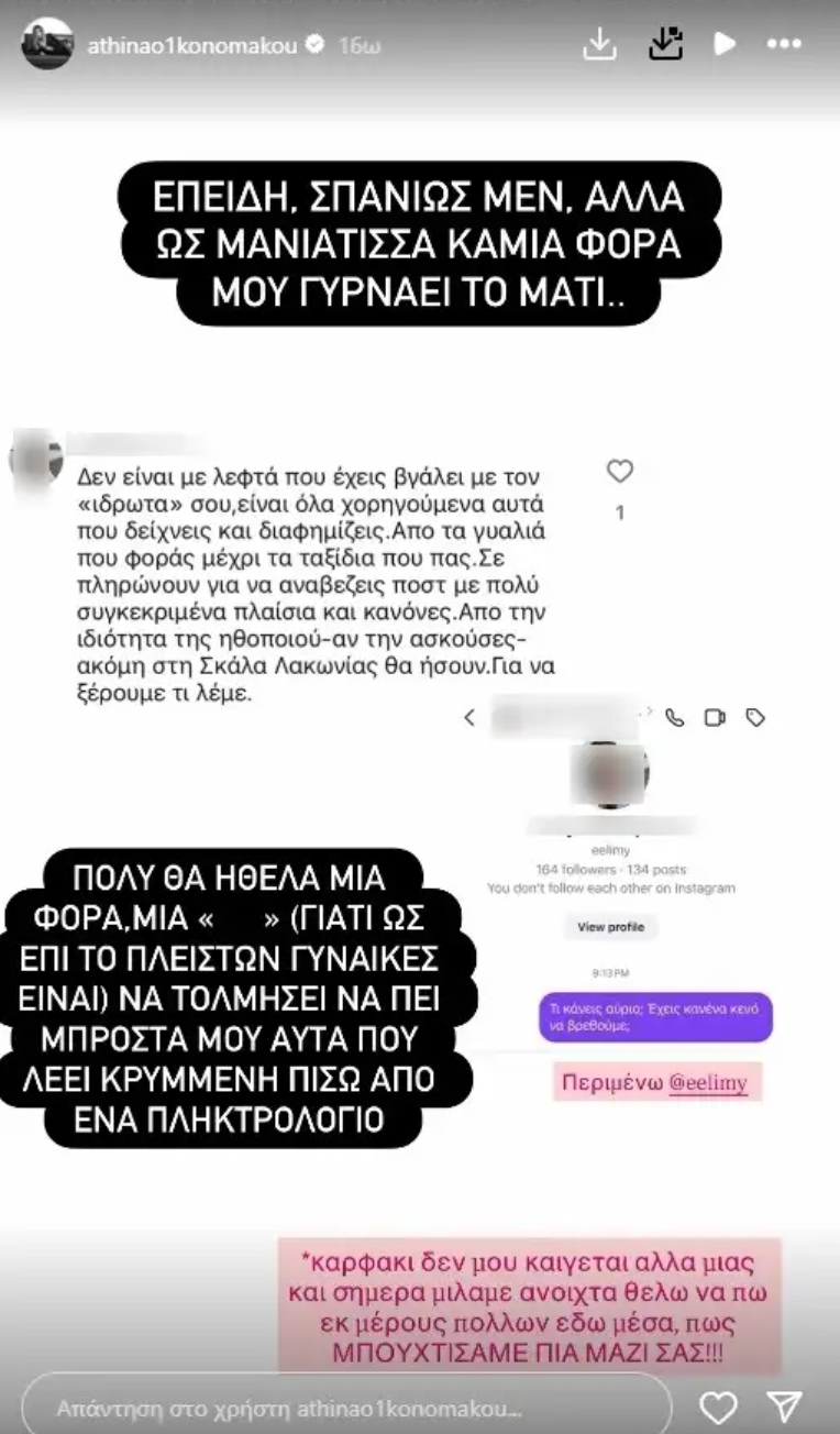 «Δεν είναι με λεφτά που έχεις βγάλει από τον “ιδρώτα” σου, είναι όλα χορηγούμενα αυτά που δείχνεις και διαφημίζεις. Από τα γυαλιά που φοράς μέχρι τα ταξίδια που πας. Σε πληρώνουν για να ανεβάζεις ποστ με πολύ συγκεκριμένα πλαίσια και κανόνες. Από την ιδιότητα της ηθοποιού – αν την ασκούσες – ακόμη στη Σκάλα Λακωνίας θα ήσουν. Για να ξέρουμε τι λέμε» έγραφε το μήνυμα που δέχτηκε η Αθηνά Οικονομάκου, με την ηθοποιό να απαντά μέσω story της γράφοντας: