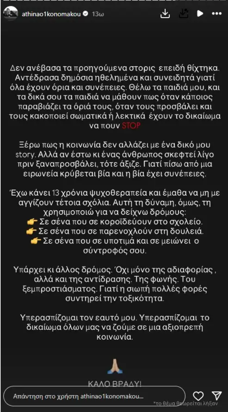 Στη συνέχεια, η Αθηνά Οικονομάκου προχώρησε σε νέα ανάρτηση στην οποία έγραψε, «Δεν ανέβασα τα προηγούμενα στόρι επειδή θίχτηκα. Αντέδρασα δημόσια ηθελημένα και συνειδητά γιατί όλα έχουν όρια και συνέπειες. Θέλω τα παιδιά μου, και τα δικά σου παιδιά να μάθουν πως όταν κάποιος παραβιάζει τα όριά τους, όταν τα προσβάλλει και τα κακοποιεί σωματικά ή λεκτικά, έχουν το δικαίωμα να πουν stop.