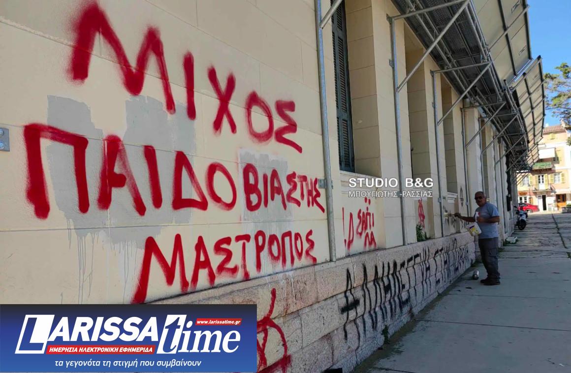 Επίθεση δέχτηκαν τα γραφεία της Νέας Δημοκρατίας αλλά και τα Δικαστήρια στο Ναύπλιο, όπου άγνωστοι έγραψαν συνθήματα, λίγο πριν απαγγελθεί η απόφαση περί ενοχής του Ηλία Μίχου για την υπόθεση της σεξουαλικής κακοποίησης της 12χρονης από τα Σεπόλια.