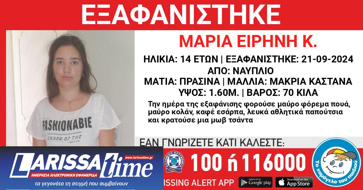Συναγερμός έχει σημάνει στις αρχές για την εξαφάνιση μίας 14χρονης από την περιοχή του Ναυπλίου. Πρόκειται για την Μαρία Ειρήνη Κ. τα ίχνη της οποίας χάθηκαν στις 21/09/2024 και ώρα 14:30.