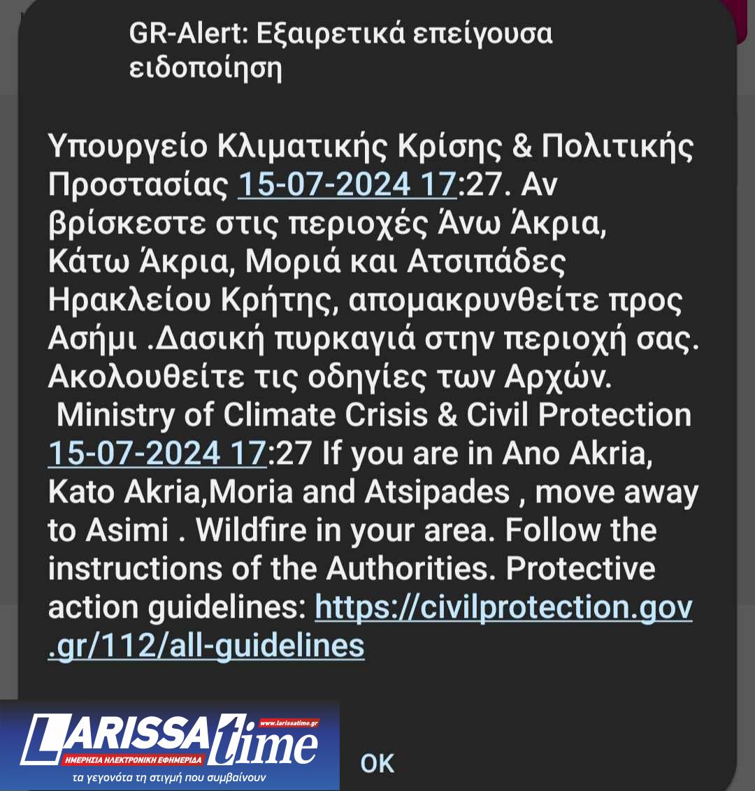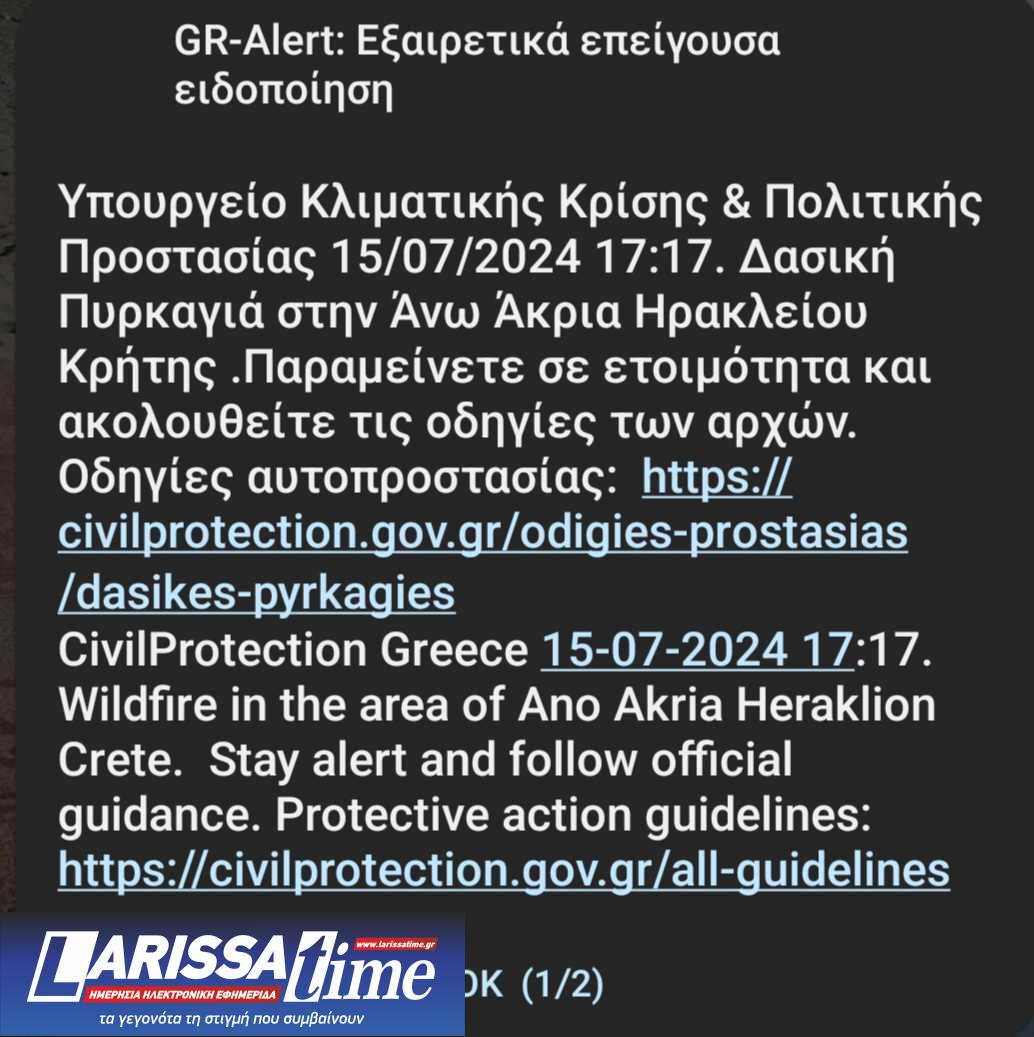 Λίγο μετά τις 17.00 ήχησε το 112 για πρώτη φορά σε κατοίκους στην ευρύτερη περιοχή του Ηρακλείου, για την ενημέρωση τους σχετικά με την ύπαρξη πυρκαγιάς στα άγρια, ζητώντας τους να μείνουν σε ετοιμότητα και να ακολουθούν τις οδηγίες των Αρχών.
