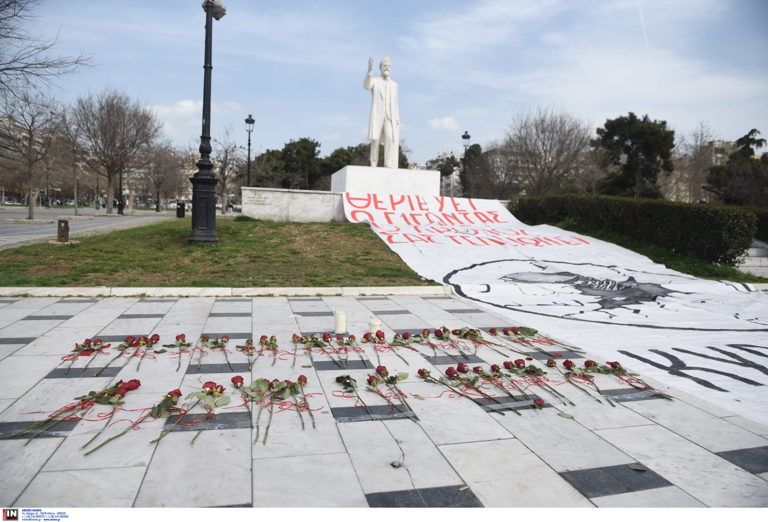 Όπως μεταδίδει το thesstoday.gr, οι φοιτητές άφησαν 57 κόκκινα τριαντάφυλλα και κεριά μπροστά από το άγαλμα Βενιζέλου, στη μνήμη των θυμάτων.