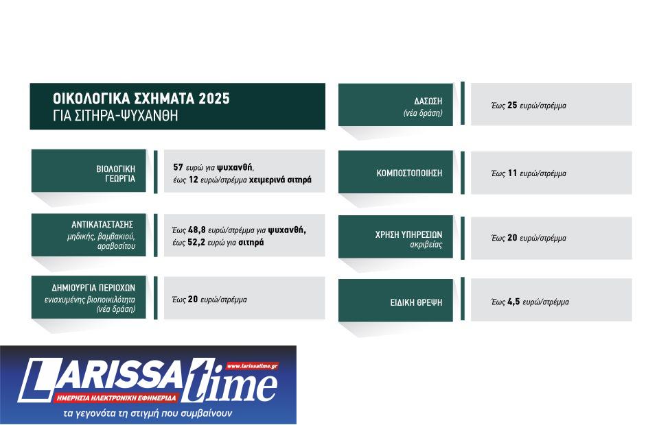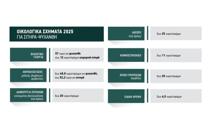 - Υποδράσεις ψηφιακών εργαλείων: Χρήση υπηρεσιών ακριβείας στον ψεκασµό 7 ευρώ το στρέµµα και κατά τη λίπανση 10 ευρώ το στρέµµα. Χρήση λιπασµάτων βραδείας αποδέσµευσης, ή/και λιπασµάτων µε παρεµποδιστές ή/και λιπασµάτων µε βιοδιεγέρτες σε αροτραίες καλλιέργειες 4,5 ευρώ το στρέµµα. Για χρήση προϊόντων µε βιοδιεγέρτες σε αροτραίες καλλιέργειες 3 ευρώ/στρέµµα.