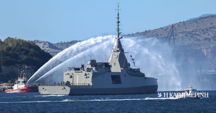 Τη σύγχρονη φρεγάτα, την οποία ο υπουργός Εθνικής Αμυνας, Νίκος Δένδιας, χαρακτήρισε την «πιο ισχυρή στον πλανήτη», υποδέχθηκαν σε σχηματισμό 8 μονάδες του Π.Ν. Παράλληλα, από αέρος, συμμετείχαν στην τελετή τρία ελικόπτερα Aegean Hawk του Πολεμικού Ναυτικού.