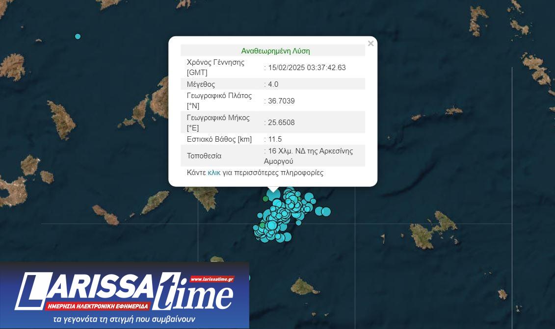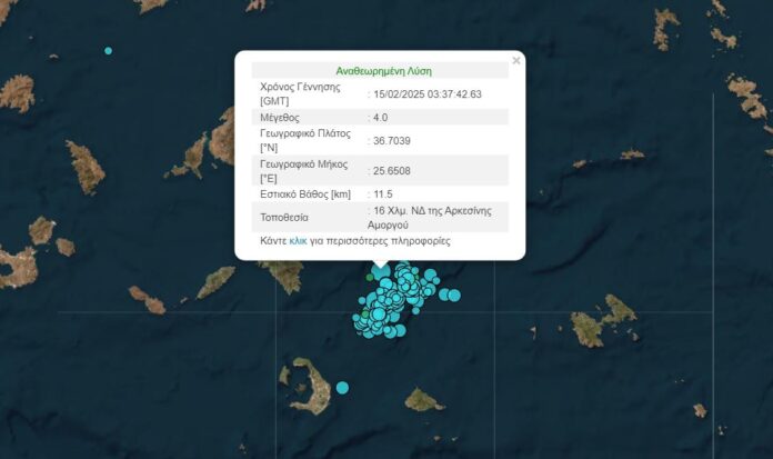 Νέος σεισμός έντασης 4 βαθμών της κλίμακας Ρίχτερ σημειώθηκε τα ξημερώματα του Σαββάτου (15/2) ανοιχτά της Αμοργού.