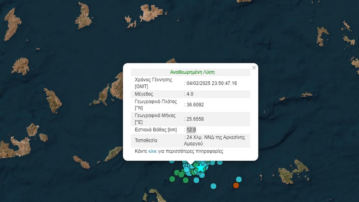 Σύμφωνα με το Γεωδυναμικό Ινστιτούτο το επίκεντρο της δόνηση εντοπίζεται στα 24 χλμ. Νότια, Νοτιοδυτικά της Αρκεσίνης Αμοργού, ενώ το εστιακό βάθος υπολογίζεται στα 12 χλμ.