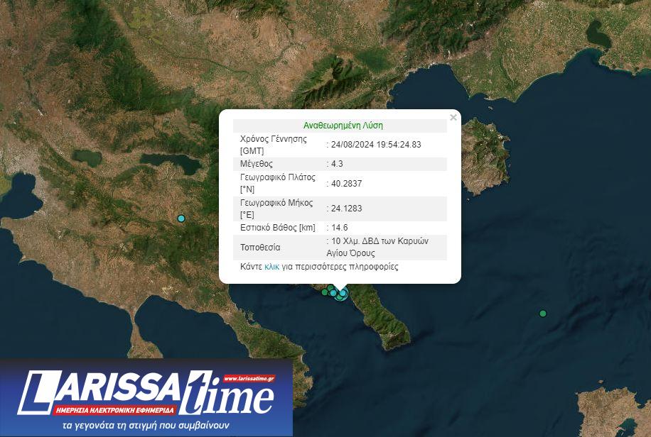 Το επίκεντρο της δόνησης εντοπίζεται στο θαλάσσιο χώρο 10 χλμ. ΔΒΔ των Καρυών Αγίου Όρους».