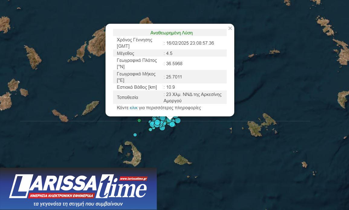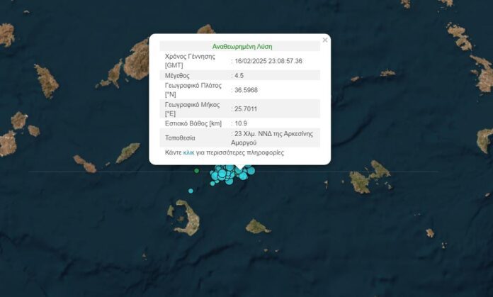 Νέος σεισμός έντασης 4,5 βαθμών της κλίμακας Ρίχτερ σημειώθηκε τις πρώτες πρωινές ώρες της Δευτέρας (17/2) ανοιχτά της Αμοργού.