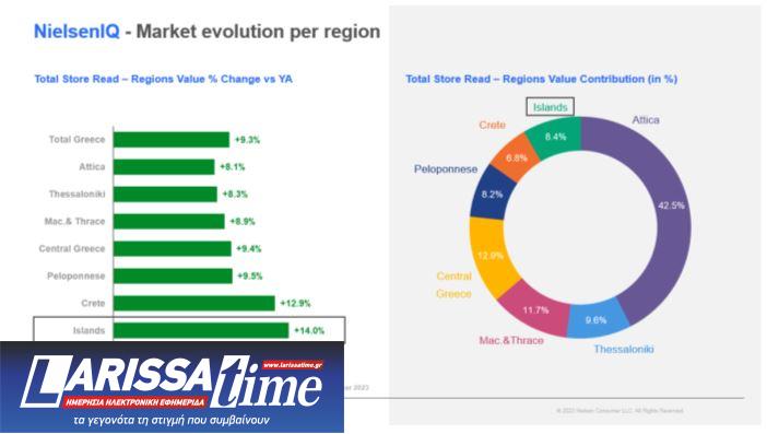 Αυτό προκύπτει από σχετική έρευνα της NielsenIQ, σύμφωνα με την οποία ενώ το 2023 ο συνολικός τζίρος της αγοράς αυξήθηκε κατά +9,3%, το αντίστοιχο ποσοστό για την Κρήτη και τα Νησιά του Ιονίου και Αιγαίου διαμορφώθηκε στο +12,9% και +14,0% αντίστοιχα.