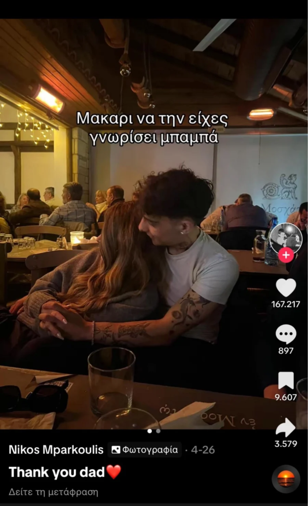 Πριν από λίγες εβδομάδες ο Νίκος Μπάρκουλης μοιράστηκε ένα νέο video με φωτογραφίες στο TikTok και μας έδειξε ένα πολύ τρυφερό στιγμιότυπο με την κοπέλα του. Το ζευγάρι ποζάρει αγκαλιασμένο στον φακό με τον 22χρονο να σημειώνει στη λεζάντα: «Μακάρι να την είχες γνωρίσει μπαμπά».