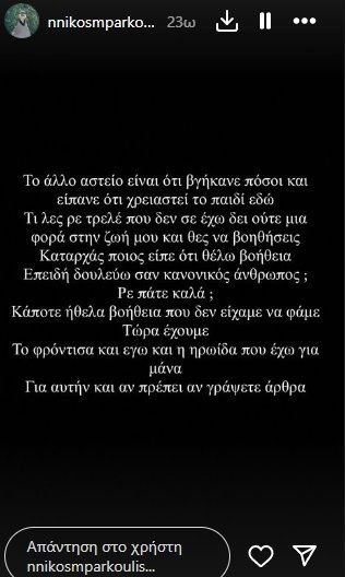 «Τα άλλα παιδιά δηλαδή που δουλεύουν, εκείνα δεν είναι άξια; Εγώ όταν ήμουν 9 και σέρβιρα καφέδες σε μνημόσυνα; Τι ήμουν; Η δουλειά δεν είναι ντροπή, ντροπή είναι να είσαι τεμπέλης», έγραψε ανάμεσα σε άλλα ενώ σε μια δεύτερη ανάρτησή του, έγραψε «Ρε πάτε καλά; Κάποτε ήθελα βοήθεια που δεν είχαμε να φάμε, τώρα έχουμε. Το φρόντισα κι εγώ και η ηρωίδα που έχω για μάνα».