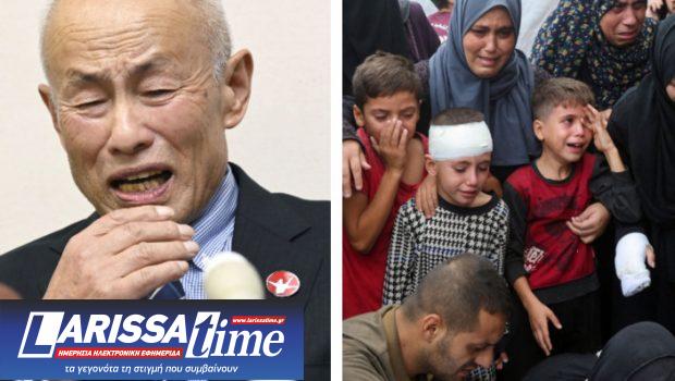 «Στη Γάζα τα παιδιά είναι βουτηγμένα στο αίμα. Είναι όπως στην Ιαπωνία πριν από 80 χρόνια», δήλωσε ο Τοσιγιούκι Μιμάκι σε συνέντευξη Τύπου στο Τόκιο.