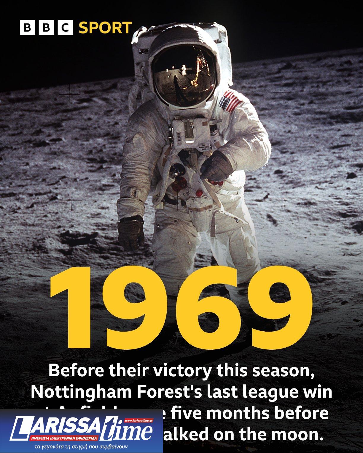 «1969. Πριν από την νίκη της αυτήν την σεζόν, η τελευταία νίκη της Νότιγχαμ στο Άνφιλντ ήταν πέντε μήνες πριν πατήσουν για πρώτη φορά οι άνθρωποι στην Σελήνη» αναφέρει η ανάρτηση, καθώς η τελευταία φορά που νίκησε η Νότιγχαμ στην έδρα της Λίβερπουλ ήταν τον Φεβρουάριο του 1969.