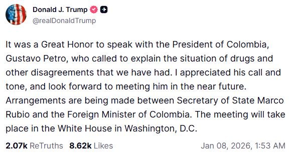 «Εκτίμησα την κλήση και τον τόνο του και ανυπομονώ να τον συναντήσω στο εγγύς μέλλον. Γίνονται διευθετήσεις μεταξύ του υπουργού Εξωτερικών Μάρκο Ρούμπιο και του υπουργού Εξωτερικών της Κολομβίας. Η συνάντηση θα πραγματοποιηθεί στο Λευκό Οίκο στην Ουάσιγκτον». Η κολομβιανή κυβέρνηση επιβεβαίωσε την κλήση, η οποία διήρκεσε 35 λεπτά, και την χαρακτήρισε «καλή και θετική».