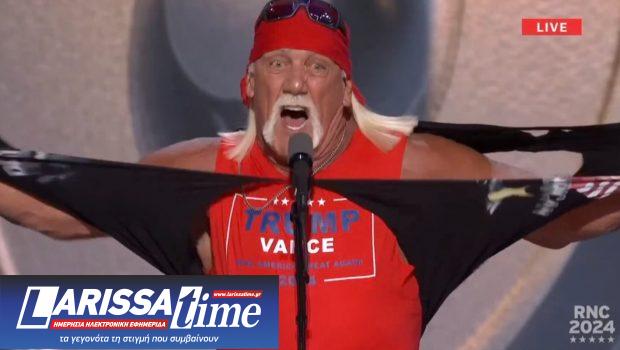 Ο Hogan —λίγο πριν ο Τραμπ παραλάβει το χρίσμα του κόμματος— εκφώνησε έναν από τους πιο έντονους λόγους του συνεδρίου. Αποκάλεσε τον πρώην αμερικάνο πρόεδρο «ήρωα» και «μονομάχο»… πριν σκίσει το πουκάμισό του.