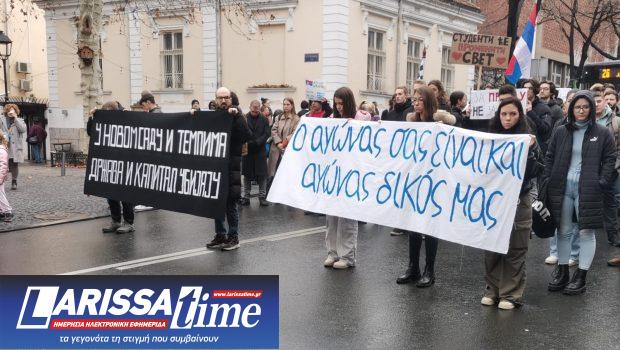 Στην κεφαλή της πορείας των Σέρβων φοιτητών υπήρχε ένα πανό όπου αναγράφονταν: «Ο αγώνας σας είναι και αγώνας δικός μας». Οι φοιτητές κρατούσαν ελληνικές και σερβικές σημαίες όπως και πλακάτ με συνθήματα κατά της διαφθοράς και υπέρ της απόδοσης δικαιοσύνης.