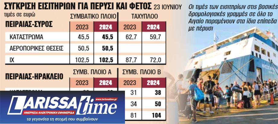 Ενδεικτικά να αναφέρουμε ότι η τιμή στην οικονομική θέση από Πειραιά για Σύρο με συμβατικό πλοίο στις 23 Ιουνίου 2023 ήταν 45,5 ευρώ ενώ ίδια ακριβώς είναι και φέτος. Επίσης με ταχύπλοο την ίδια ημέρα πέρυσι ήταν στα 62,7 ευρώ και φέτος μειώθηκε ελαφρώς στα 59,7 ευρώ. Ανάλογη είναι η εικόνα και από τη Ραφήνα, όπου οι τιμές στα συμβατικά πλοία προς την Τήνο παραμένουν στα ίδια επίπεδα, στα 35-49 ευρώ, ανάλογα με το είδος της θέσης, με πέρυσι, όπως και στα ταχύπλοα (από 59 μέχρι και 95,7 ευρώ).