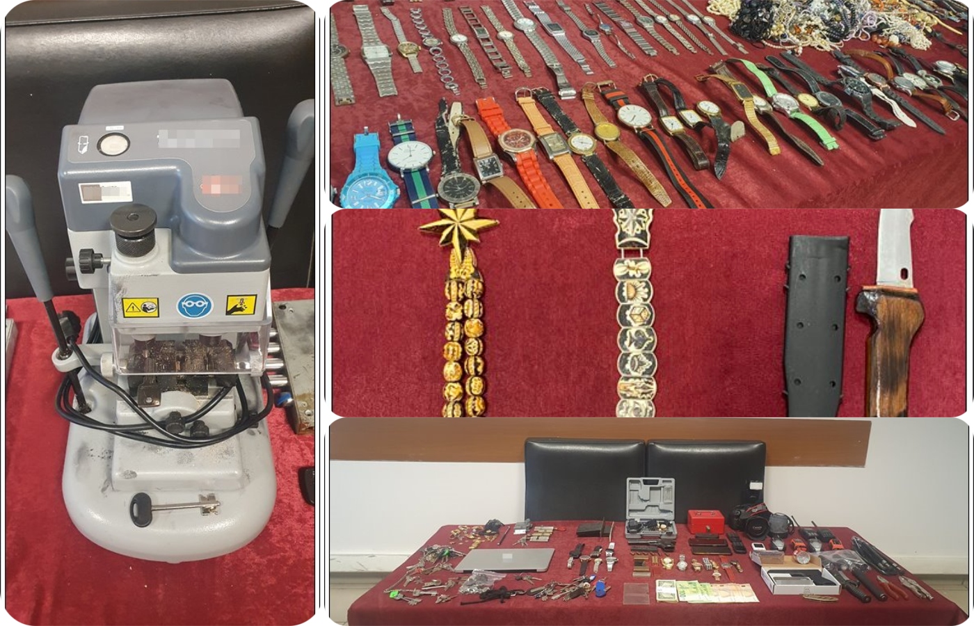 -Πλήθος κλειδιών θυρών οικιών διαφόρων τύπων και μαρκών με εμφανείς εξωτερικές παραποιήσεις – παρεμβάσεις, αυτοσχέδιων διαρρηκτικών εργαλείων διαφόρων κλειδαριών και τύπων, μηχανισμών κλειδαριών θωρακισμένων θυρών, ομφαλών θυρών,