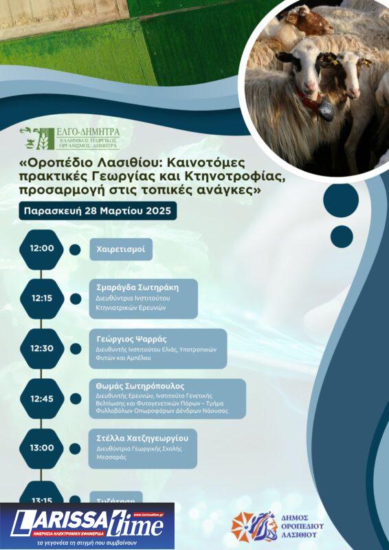 Ο Δήμος Οροπεδίου Λασιθίου και ο ΕΛΓΟ- ΔΗΜΗΤΡΑ διοργανώνουν εκδήλωση με θέμα «Οροπέδιο Λασιθίου «Καινοτόμες πρακτικές Γεωργίας και Κτηνοτροφίας – προσαρμογή στις τοπικές ανάγκες» την Παρασκευή 28 Μαρτίου 2025 στις 12.00 μ.μ, η οποία θα πραγματοποιηθεί στην αίθουσα Δημαρχείου.