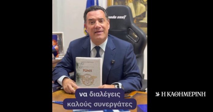«Ο Αλέξης Τσίπρας μού έστειλε ως δώρο το βιβλίο του “Ιθάκη” με προσωπική αφιέρωση και τον ευχαριστώ. Ως γνήσιος βιβλιοπώλης και εγώ θα του στείλω το νέο δικό μου βιβλίο: “Ρώμη”», αναφέρει σε ανάρτησή του ο υπουργός Υγείας Αδωνις Γεωργιάδης, απαντώντας στο βίντεο που ανήρτησε πιο πριν ο πρώην πρωθυπουργός.