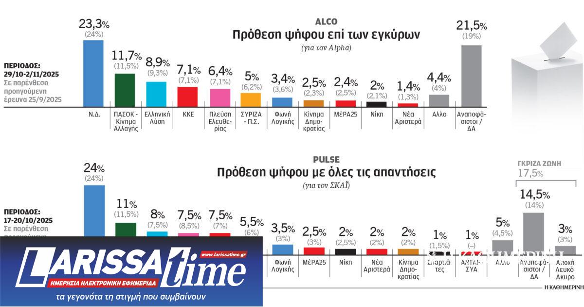 Η «γαλάζια» παράταξη σε πολλές μετρήσεις στην πρόθεση ψήφου εμφανίζεται κάτω από το όριο του 25% που δίνει το εκλογικό μπόνους, και ο κίνδυνος ακόμη και της ακυβερνησίας είναι πλέον ορατός, καθώς ο εκλογικός νόμος μετατρέπεται αυτόματα σε απλή αναλογική. Η πιο πρόσφατη έρευνα της ALCO για λογαριασμό του Alpha έδειξε τη Ν.Δ. στο 23,3% στην πρόθεση ψήφου επί των εγκύρων. Η Pulse στην τελευταία μέτρησή της αποτύπωνε την κυβερνώσα παράταξη στο 24%.