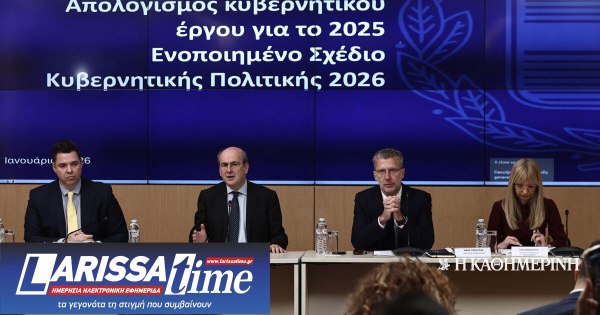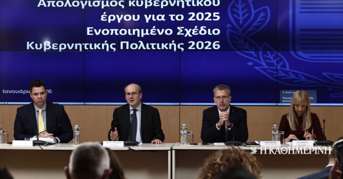 Το Ενοποιημένο Σχέδιο Κυβερνητικής Πολιτικής για το 2026, καθώς και ο απολογισμός του κυβερνητικού έργου για το 2025, παρουσιάστηκαν σήμερα από τον αντιπρόεδρο της κυβέρνησης Κωστή Χατζηδάκη, τον υπουργό Επικρατείας Ακη Σκέρτσο, τον υφυπουργό παρά τω πρωθυπουργώ Θανάση Κοντογεώργη και τη γενική γραμματέα Συντονισμού Εύη Δραμαλιώτη.