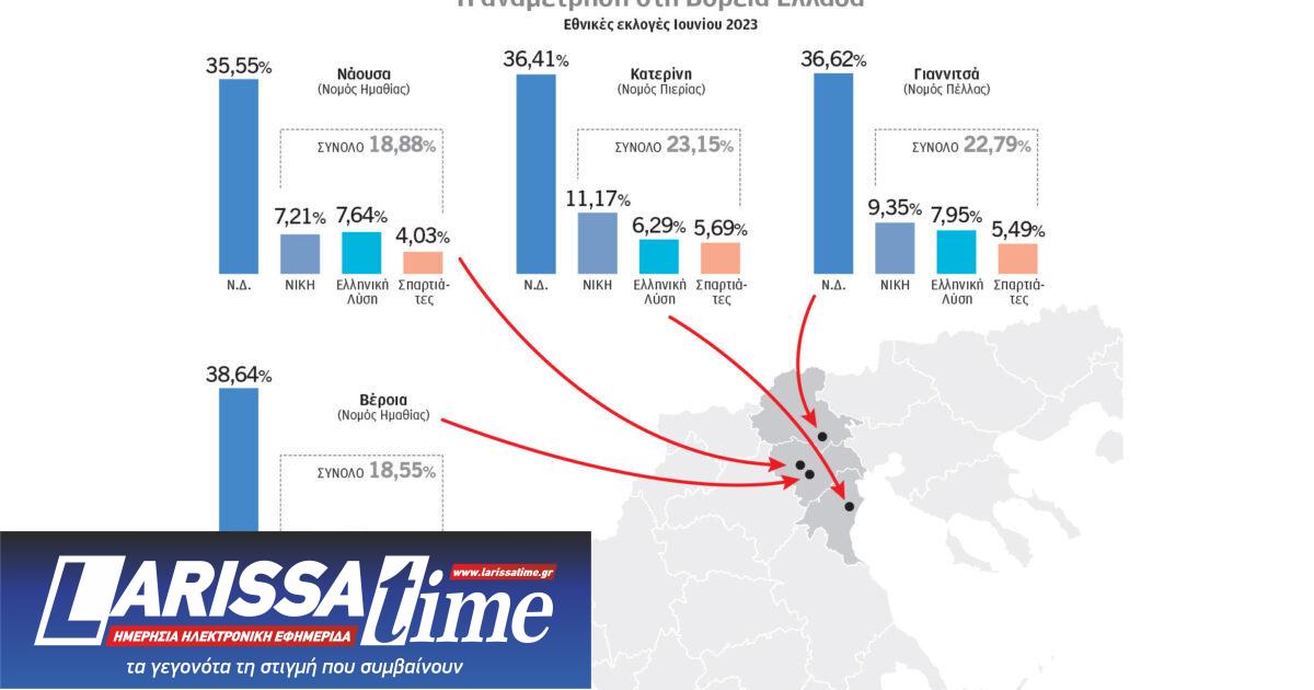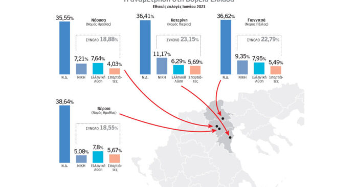 Συγκεκριμένα, στην Κατερίνη στις εθνικές εκλογές του περασμένου Ιουνίου η Νίκη πήρε 11,17%, ενώ ο Κυριάκος Βελόπουλος 6,29%. Μαζί με τους Σπαρτιάτες (5,69%) τα τρία κόμματα έφτασαν το εξωπραγματικό ποσοστό 23,15%! Στα Γιαννιτσά, που θα επισκεφθεί την Παρασκευή ο πρωθυπουργός, η Νίκη έλαβε 9,35%, η Ελληνική Λύση 7,95% και μαζί με τους Σπαρτιάτες (5,49%) έφτασαν το 22,79%. Στη Βέροια του νομού Ημαθίας η Ελληνική Λύση έλαβε 7,8%, η Νίκη 5,08% και οι Σπαρτιάτες 5,67%, φτάνοντας μαζί το 18,55%.