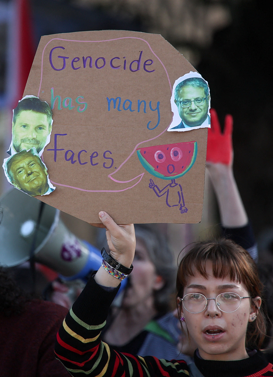Μια διαδηλώτρια κρατά πλακάτ με τις εικόνες του Ισραηλινού υπουργού Εθνικής Ασφάλειας Ιταμάρ Μπεν-Γβίρ, του υπουργού Οικονομικών Μπεζαλέλ Σμοτρίτς και του Προέδρου των ΗΠΑ Ντόναλντ Τραμπ, κατά τη διάρκεια διαδηλώσεων Ισραηλινών μετά την ψήφιση, τη Δευτέρα, νόμου από το ισραηλινό κοινοβούλιο που καθιστά την θανατική ποινή με απαγχονισμό την προκαθορισμένη ποινή για Παλαιστινίους που καταδικάζονται από στρατιωτικά δικαστήρια για θανατηφόρες επιθέσεις, κοντά στην Κνέσετ, το ισραηλινό κοινοβούλιο, στην Ιερουσαλήμ, στις 31 Μαρτίου 2026. REUTERS/Ammar Awad