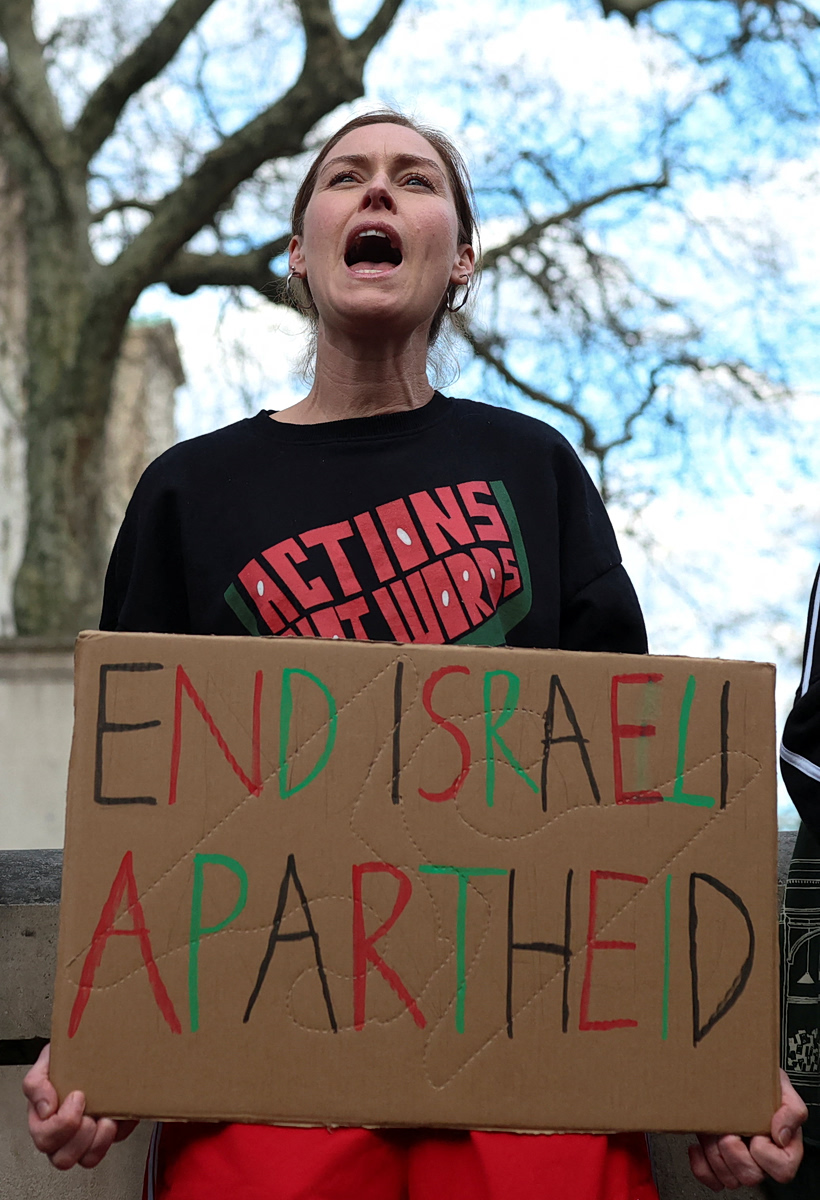 Μια φιλοπαλαιστινιακή ακτιβίστρια κρατά μια πινακίδα κατά τη διάρκεια διαδήλωσης στο Λονδίνο της Βρετανίας, στις 31 Μαρτίου 2026, ενάντια στον νέο ισραηλινό νόμο περί θανατικής ποινής για Παλαιστινίους που έχουν καταδικαστεί από στρατιωτικά δικαστήρια για θανατηφόρες επιθέσεις. REUTERS/Hannah McKay