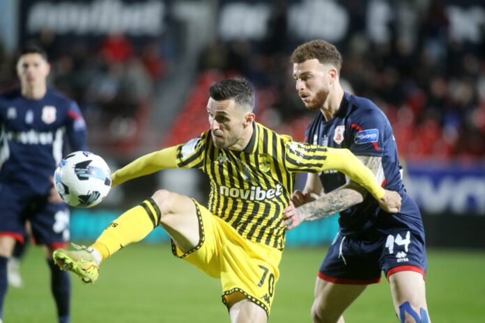 Ένα φάουλ του Φέλτες (2΄) που απέκρουσε ο Αθανασιάδης κι ένα σουτ του Ράτσιτς (9΄) που πέρασε λίγο άουτ ήταν οι μοναδικές φάσεις ως το 27ο λεπτό, όταν ο Μορόν έπεσε στην περιοχή των γηπεδούχων και διαμαρτυρήθηκε για πέναλτι, με τον διαιτητή Ζαμπαλά να μην συγκινείται.