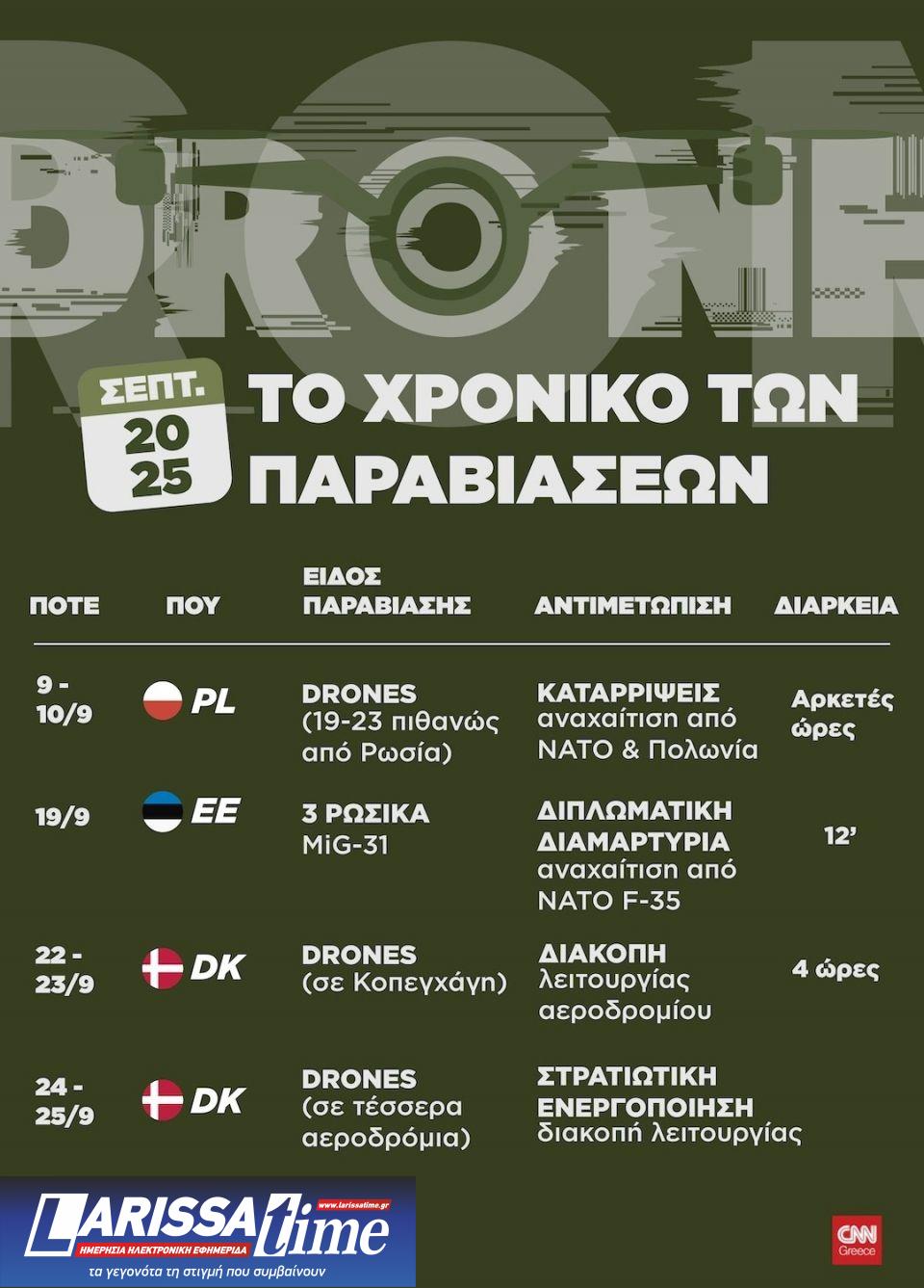 Οι απειλές ολοένα και αυξάνονται, καθώς από την Πολωνία ως τη Δανία και από την Εσθονία ως τα Βαλτικά κράτη, drones άγνωστης ή εχθρικής προέλευσης παραβιάζουν ολοένα και συχνότερα τον εναέριο χώρο της Ευρωπαϊκής Ένωσης, διεξάγοντας αποστολές αναγνώρισης, δοκιμάζοντας τα όρια του ΝΑΤΟ και προκαλώντας επιχειρησιακού τύπου συναγερμούς.