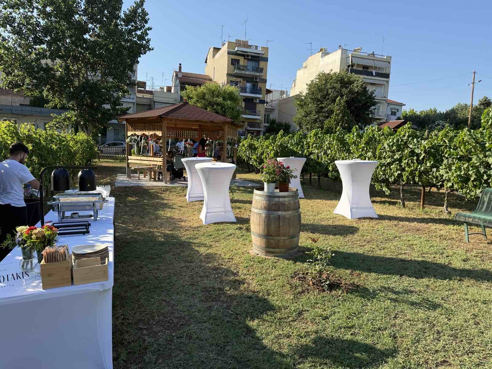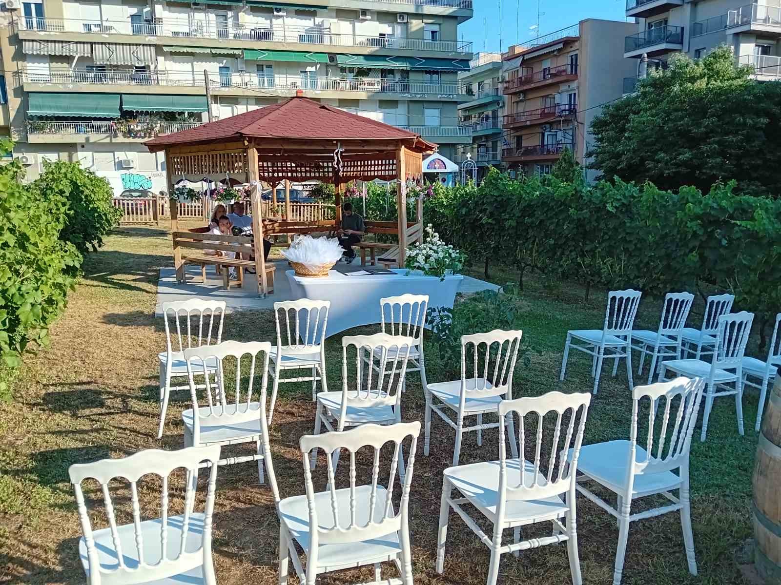 Ανάμεσα στις ψηλές πολυκατοικίες, στην «καρδιά» της Θεσσαλονίκης, εξελίσσεται ένα διαφορετικό μυστήριο. Ο πρώτος πολιτικός γάμος στον αστικό αμπελώνα της πόλης είναι γεγονός, με τη νύφη και τον γαμπρό να ανταλλάσσουν όρκους αιώνιας αγάπης και πίστης δίπλα από τα αμπέλια, στη σκιά που προσφέρουν οι ροδακινιές, οι βερικοκιές, οι κερασιές κι ένα σωρό ακόμη οπωροφόρα δέντρα.