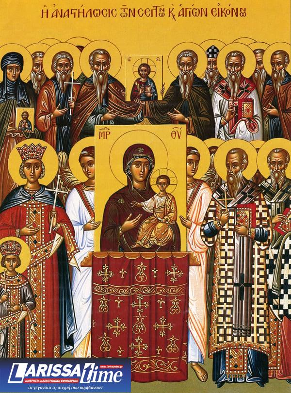 Η πρώτη Κυριακή της Αγίας και Μεγάλης Τεσσαρακοστής προ του Πάσχα, είναι αφιερωμένη στην Κυριακή της Ορθοδοξίας. Η Εκκλησία μας παράλληλα, τιμάει την αποκατάσταση και αναστήλωση των εικόνων. Σε όλους τους Ιερούς Ναούς, τιμάται με ιδιαίτερη λαμπρότητα η γιορτή των Αγίων εικόνων. Μετά την Θεία Λειτουργία, γίνεται η καθιερωμένη περιφορά των εικόνων, στον προαύλιο χώρο όλων των Εκκλησιών.