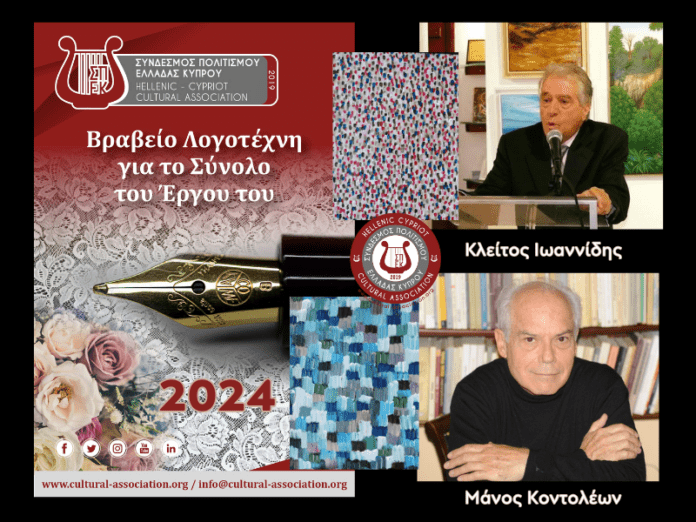 Ο Σύνδεσμος Πολιτισμού Ελλάδας Κύπρου (ΣΠΕΚ) απένειμε το Βραβείο Λογοτέχνη για το Σύνολο του Έργου του 2024 στους σπουδαίους δημιουργούς Μάνο Κοντολέων και Κλείτο Ιωαννίδη. Οι δύο αυτοί λογοτέχνες, με το πολυεπίπεδο έργο και την αφοσίωσή τους στα Ελληνικά Γράμματα, αναδεικνύουν τη δύναμη της γλώσσας, του πολιτισμού και της ανθρωπιάς. Τα έργα τους αποτελούν φάρους έμπνευσης που ταξιδεύουν πέρα από σύνορα, προάγοντας πανανθρώπινες αξίες και ενισχύοντας την πολιτιστική μας κληρονομιά. Ευχαριστούμε θερμά όλους όσοι τίμησαν την τελετή απονομής με την παρουσία τους, καθώς και την Επιτροπή του Βραβείου, που αποτελείται από αναγνωρισμένους επιστήμονες των γραμμάτων και των τεχνών, για την αφοσίωση και την αντικειμενικότητά της.