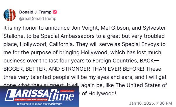 «Είναι τιμή μου να ανακοινώσω τον Τζον Βόιτ, τον Μελ Γκίμπσον και τον Σιλβέστερ Σταλόνε, ως ειδικούς πρεσβευτές σε ένα σπουδαίο αλλά πολύ ταραγμένο μέρος, το Χόλιγουντ της Καλιφόρνια», έγραψε ο Ντόναλντ Τραμπ στο Truth Social την Πέμπτη (16/1).