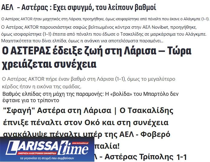 Δείτε τι έγραψε ο ηλεκτρονικός αθλητικός Τύπος της Αρκαδίας για την αναμέτρηση ΑΕΛ-Αστέρας Τρίπολης 1-1, που έγινε το Σάββατο (14/03/2026) στο AEL FC Arena, στο πλαίσιο της 25ης αγωνιστικής του πρωταθλήματος της Super League. Το aelole.gr συγκέντρωσε και σας παραθέτει τα δημοσιεύματα.