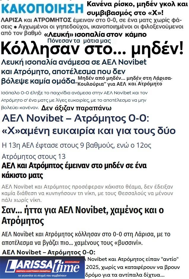 Δείτε τι έγραψε ο αθλητικός Τύπος της Αθήνας για την αναμέτρηση ΑΕΛ-Ατρόμητος 0-0, που έγινε την Κυριακή (21/12/2025) στο AEL FC ARENA, στο πλαίσιο της 15ης αγωνιστικής του πρωταθλήματος της Superleague. Το aelole.gr συγκέντρωσε και σας παραθέτει τα δημοσιεύματα.