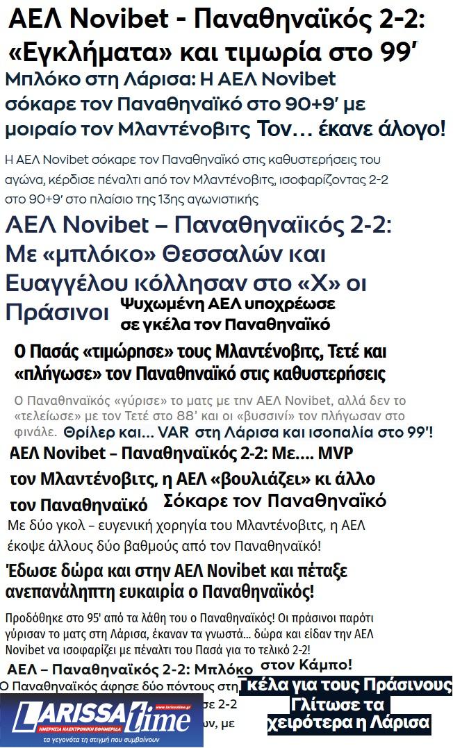 Δείτε τι έγραψε ο αθλητικός Τύπος της Αθήνας για την αναμέτρηση ΑΕΛ-Παναθηναϊκός, που έγινε την Κυριακή (07/12/2025) στο AEL FC ARENA, στο πλαίσιο της 13ης αγωνιστικής του πρωταθλήματος της Super League. Το aelole.gr συγκέντρωσε και σας παραθέτει τα δημοσιεύματα.