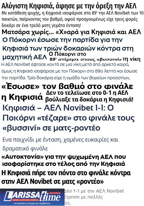 Ο Τύπος της Αθήνας για Κηφισιά-ΑΕΛ