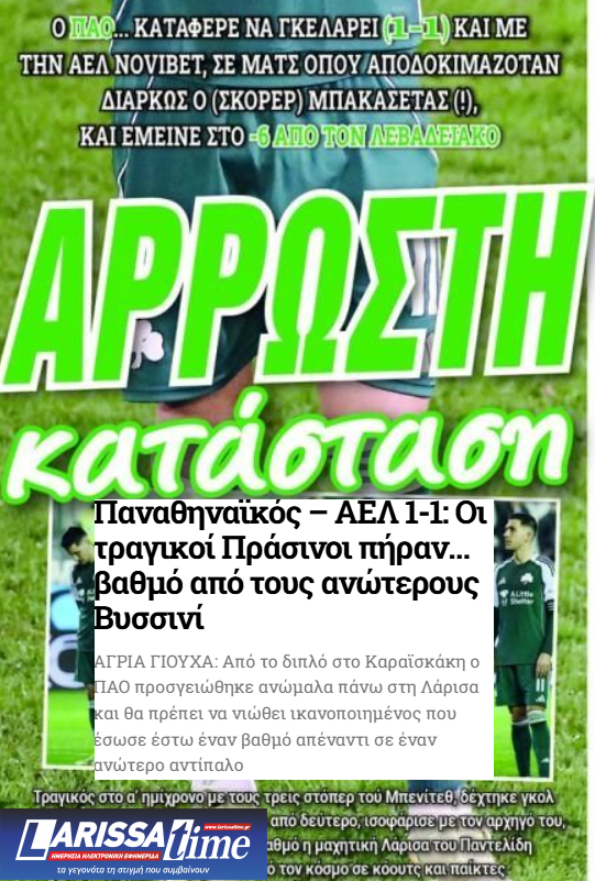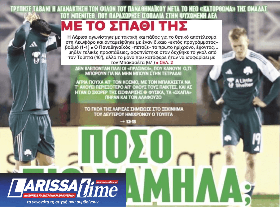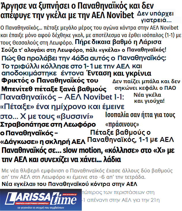 Δείτε τι έγραψε ο αθλητικός Τύπος της Αθήνας για την αναμέτρηση Παναθηναϊκός-ΑΕΛ 1-1, που έγινε την Κυριακή (15/02/2026) στο γήπεδο «Απόστολος Νικολαΐδης», στο πλαίσιο της 21ης αγωνιστικής του πρωταθλήματος της Super League. Το aelole.gr συγκέντρωσε και σας παραθέτει τα δημοσιεύματα.