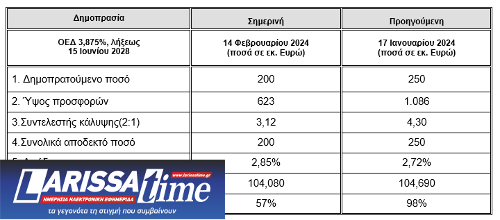 Οι συνολικές προσφορές ανήλθαν σε 623 εκατ. Ευρώ και η ημερομηνία διακανονισμού είναι η Τετάρτη 21 Φεβρουαρίου 2024.