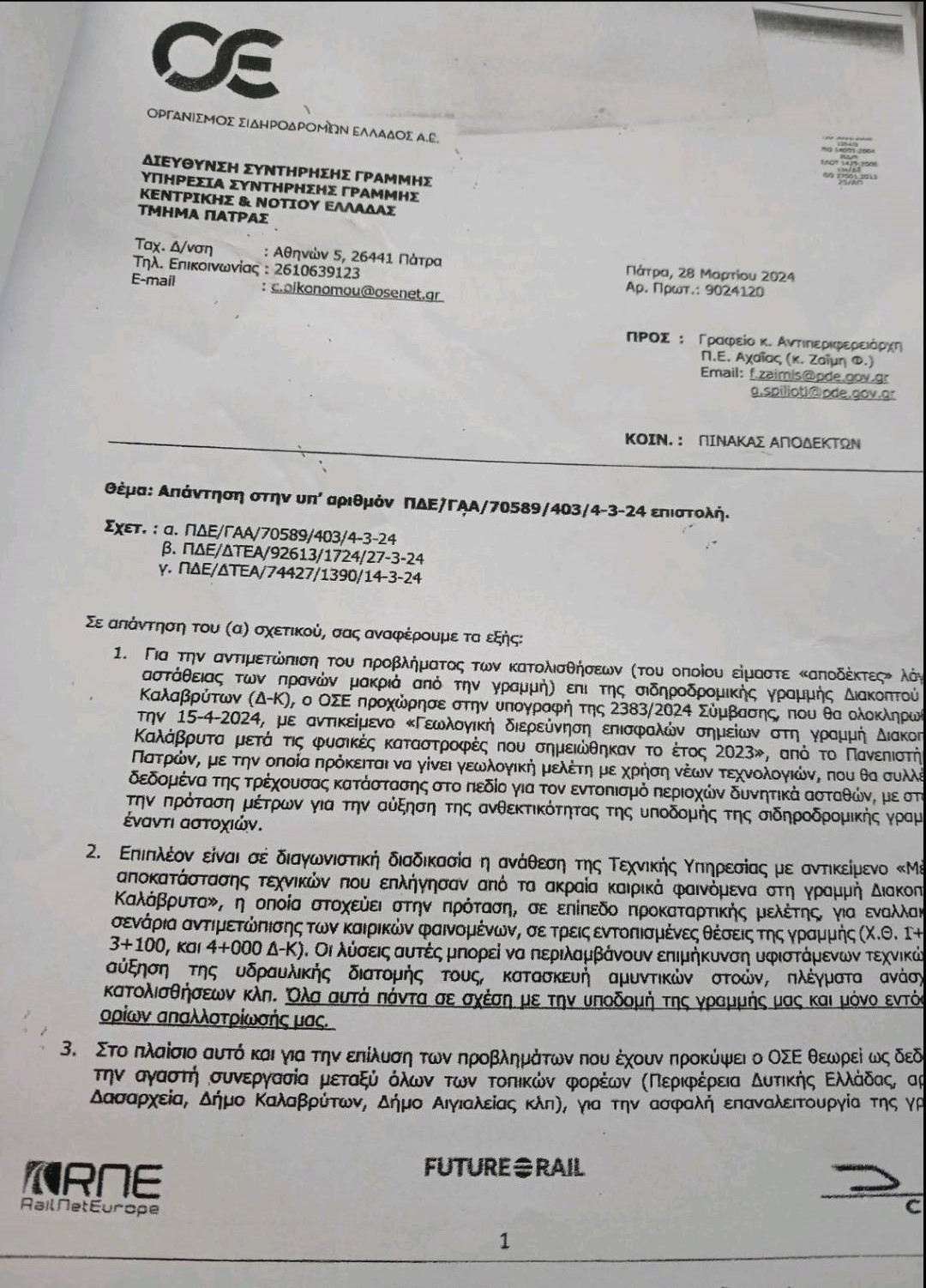«Όλοι γνώριζαν από το 2024» τονίζει ο ίδιος. «Στο εν λόγω έγγραφο επισημαίνεται: Για την αντιμετώπιση του προβλήματος των κατολισθήσεων, (του οποίου είμαστε “αποδέκτες” λόγω αστάθειας των πρανών μακριά από την γραμμή), επί της σιδηροδρομικής γραμμής Διακοπτού – Καλαβρύτων, ο ΟΣΕ προχώρησε στην υπογραφή της 2383/2024 Σύμβασης που θα ολοκληρωθεί στις 15 Απριλίου 2024, με αντικείμενο «Γεωλογική διερεύνηση επισφαλών σημείων στη γραμμή Διακοπτό – Καλάβρυτα μετά τις φυσικές καταστροφές που σημειώθηκαν το έτος 2023» από το Πανεπιστήμιο Πατρών, με την οποία πρόκειται να γίνει γεωλογική μελέτη με χρήση νέων τεχνολογιών, που θα συλλέγει δεδομένα της τρέχουσας κατάστασης για τον εντοπισμό περιοχών δυνητικά ασταθών, με στόχο την πρόταση μέτρων για την αύξηση της ανθεκτικότητας της υποδομής της σιδηροδρομικής γραμμής έναντι αστοχιών».
