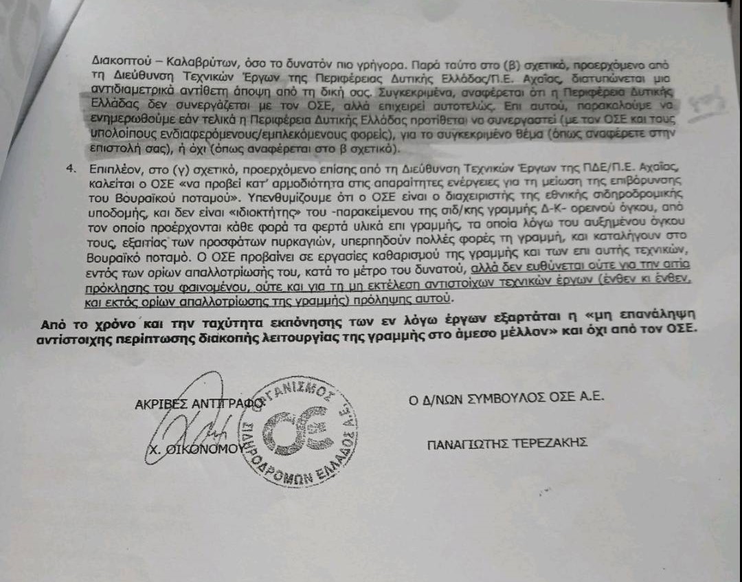 Δηλαδή από το 2024 το ίδιο το κράτος είχε καταγράψει ότι αν δεν προχωρήσουν άμεσα οι μελέτες και τα έργα, η λειτουργία της γραμμής θα τεθεί σε κίνδυνο και μπορεί να οδηγηθεί ακόμη και σε διακοπή λειτουργίας, κάτι που είχε ήδη επισημανθεί θεσμικά από τον ΟΣΕ. Στο ίδιο έγγραφο αναφέρεται επίσης ότι για παρεμβάσεις που σχετίζονται με την προστασία του Βουραϊκού ποταμού και τα αντιπλημμυρικά έργα».