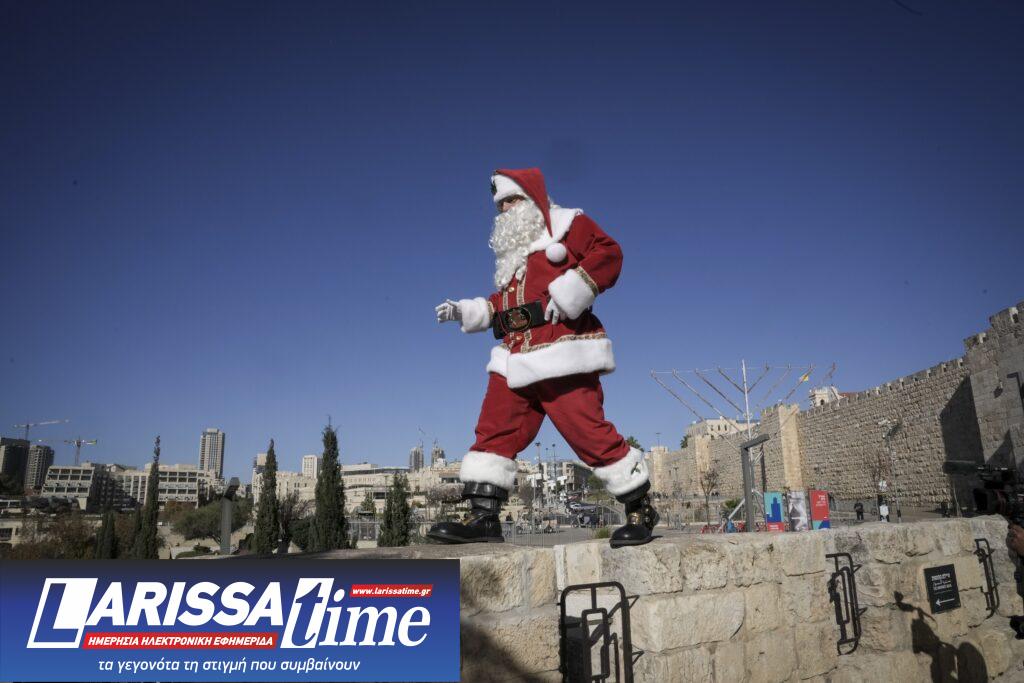 Ντυμένος με στολή Άγιου Βασίλη, περπατά κατά μήκος τοίχου δίπλα στην Παλιά Πόλη της Ιερουσαλήμ, ενόψει των Χριστουγέννων, την Πέμπτη 19 Δεκεμβρίου 2024. (AP Photo/Mahmoud Illean)