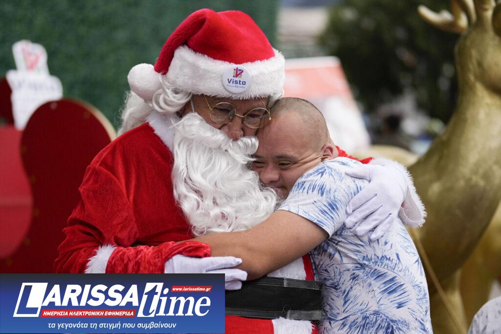 Ο Jorge Perez, ντυμένος με στολή Άγιου Βασίλη, αγκαλιάζει έναν νεαρό στο κέντρο της Μπογκοτά, Κολομβία, καθώς μοιράζει δωρισμένα δώρα σε παιδιά από τη San Bernardo, μια γειτονιά χαμηλού εισοδήματος, την Παρασκευή 20 Δεκεμβρίου 2024. (AP Photo/Fernando Vergara)
