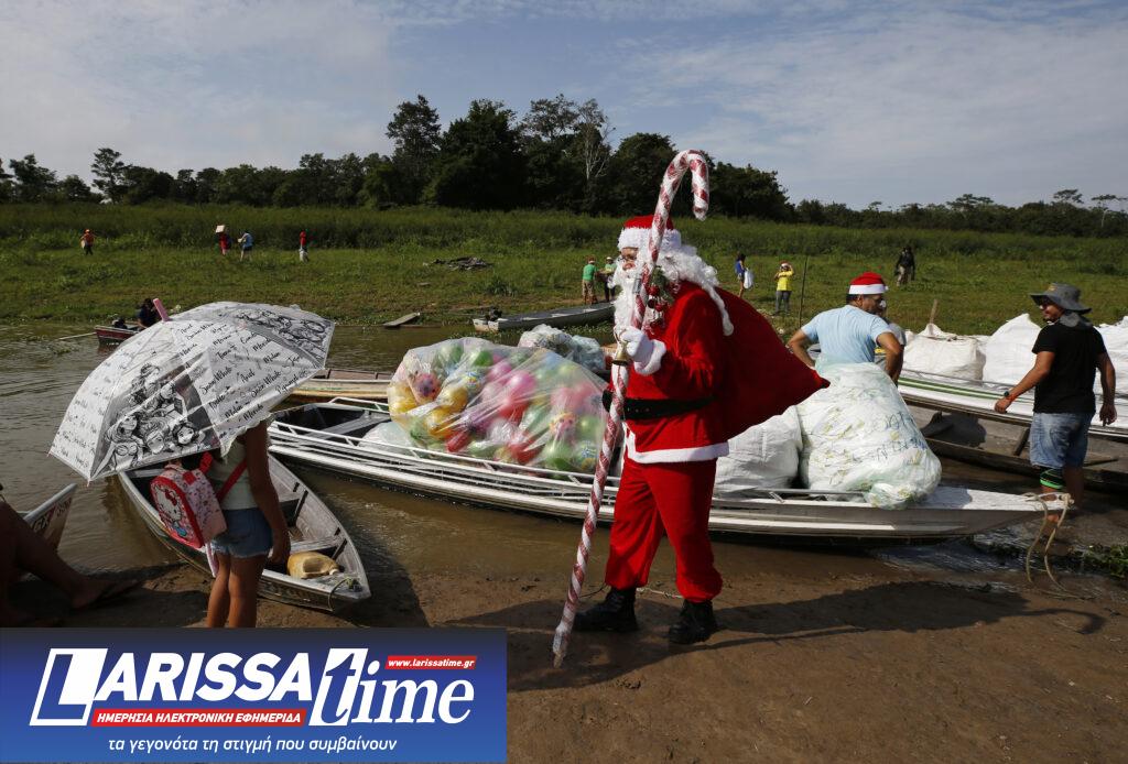 Ο Jorge Barroso, ντυμένος με στολή Άγιου Βασίλη, χαιρετά καθώς φτάνει με βάρκα για να μοιράσει χριστουγεννιάτικα δώρα σε παιδιά που ζουν στις παραποτάμιες κοινότητες του Αμαζονίου, στο Iranduba, Βραζιλία, το Σάββατο 21 Δεκεμβρίου 2024. (AP Photo/Edmar Barros)