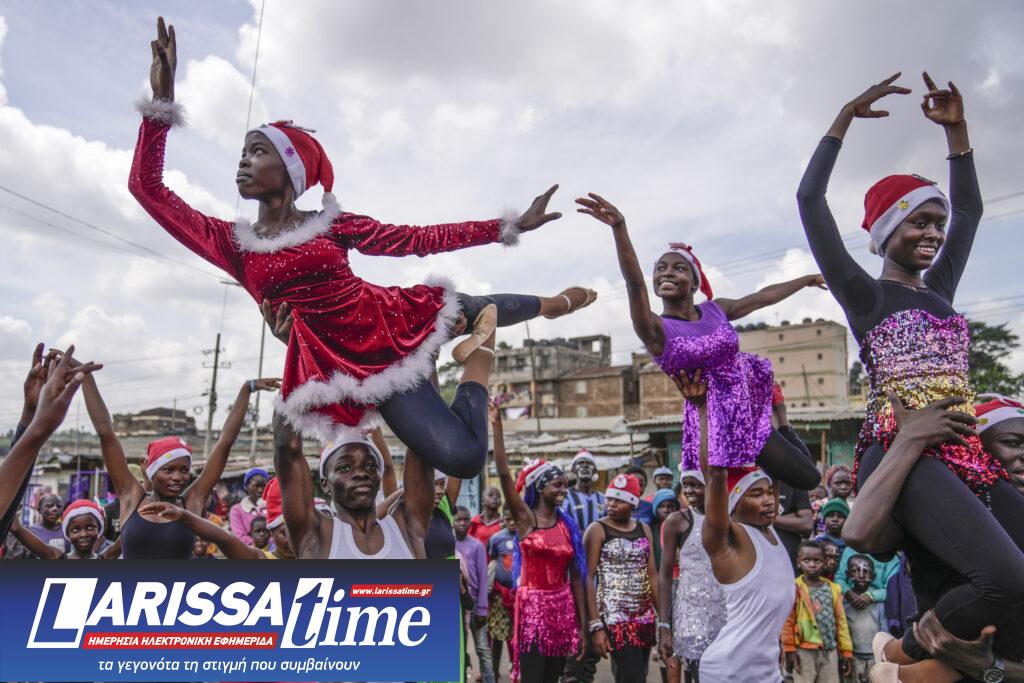 Νέοι χορευτές πραγματοποιούν μια χριστουγεννιάτικη μπαλέτα κατά τη διάρκεια εκδήλωσης στο παραγκουπόλεις Kibera, μια από τις πιο πολυσύχναστες γειτονιές της πρωτεύουσας της Κένυας, Ναϊρόμπι, το Σάββατο 21 Δεκεμβρίου 2024. (AP Photo/Brian Inganga)