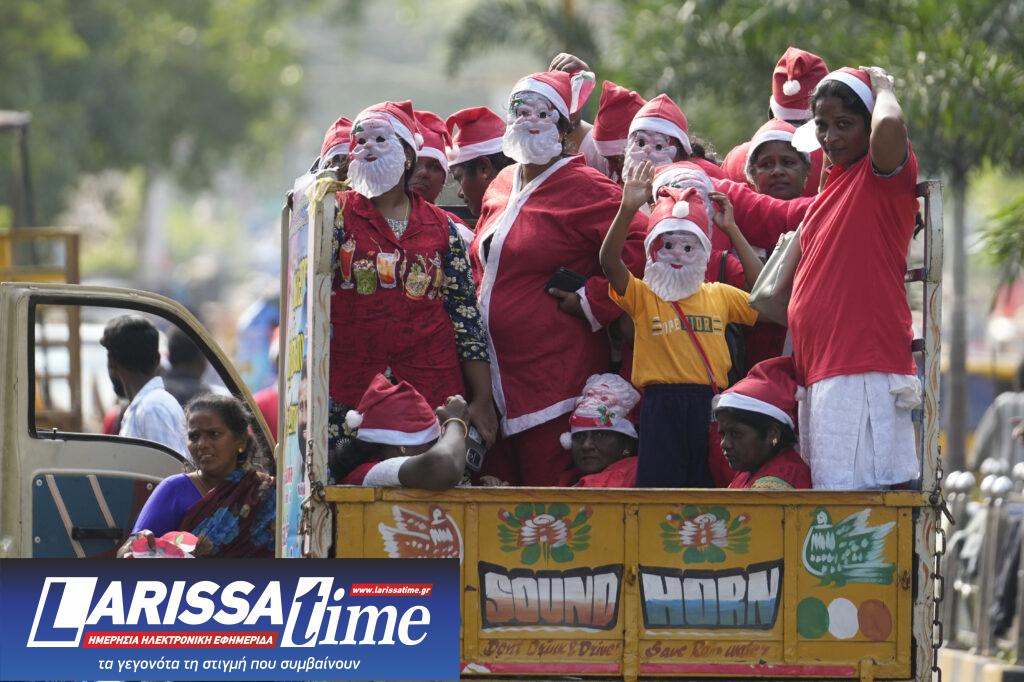 Χριστιανοί ντυμένοι με στολή Άγιου Βασίλη έφτασαν για να συμμετάσχουν σε χριστουγεννιάτικες εκδηλώσεις στην Τσενάι, Ινδία, την Κυριακή 22 Δεκεμβρίου 2024. (AP Photo/Mahesh Kumar A.)